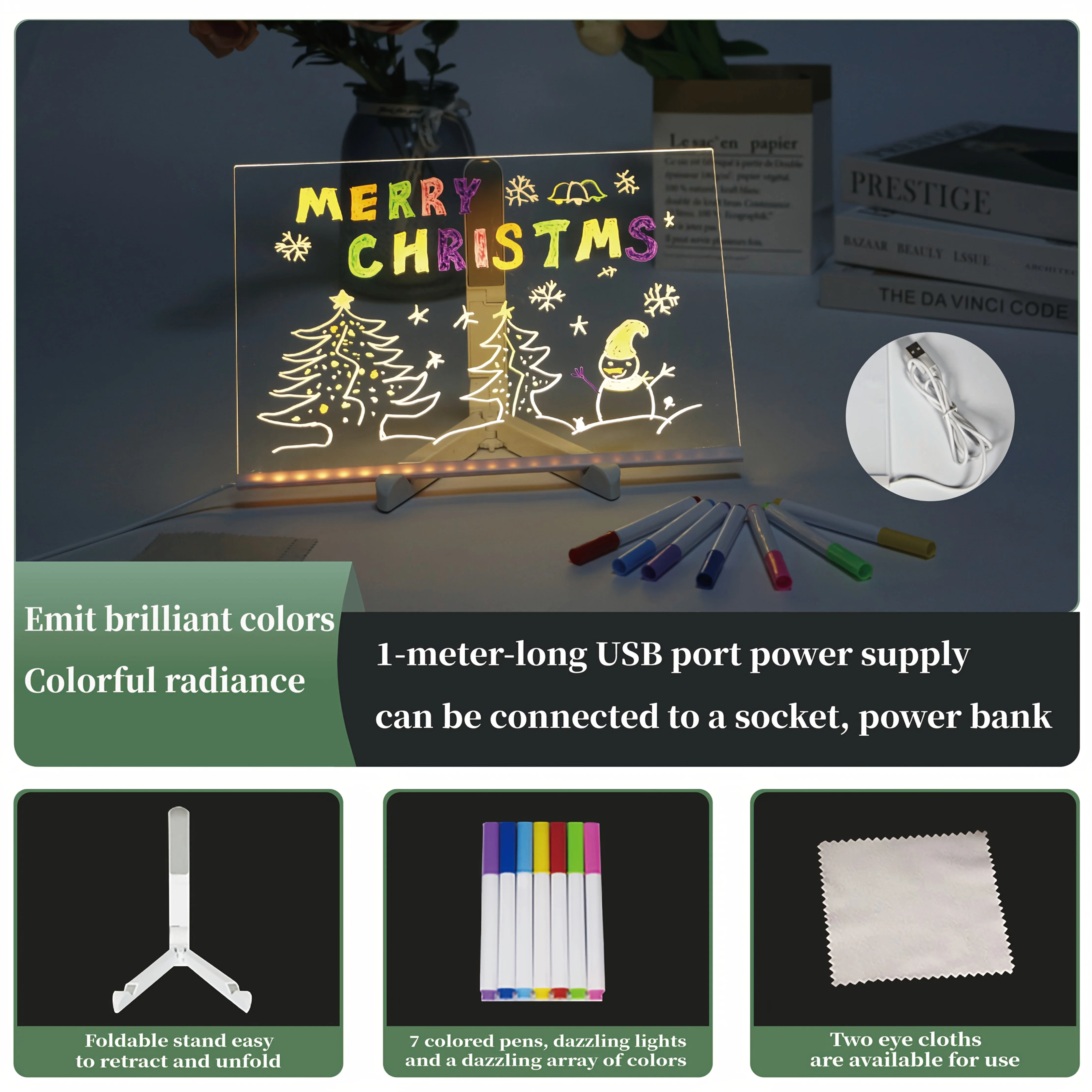 ↑1Pc Led Light up Drawing Board, Erasable Acrylic Message Board with 7-Color Pen&Night Light&Base Stand&Wipe Cloth,Usb Powered for Creative Activities, Reusable Doodle Board with Stand,Safe Non-Toxic Material,Acrylic Message Board,Drawing Board - TopDealBox
