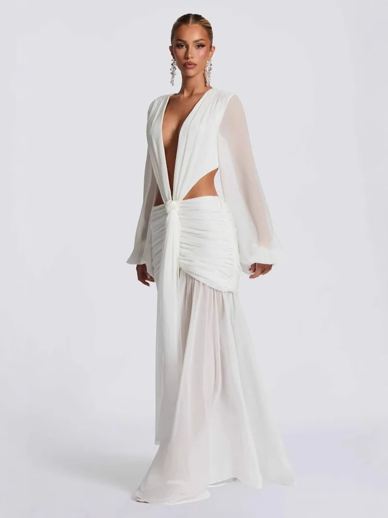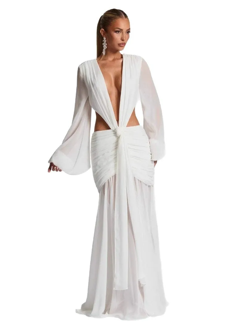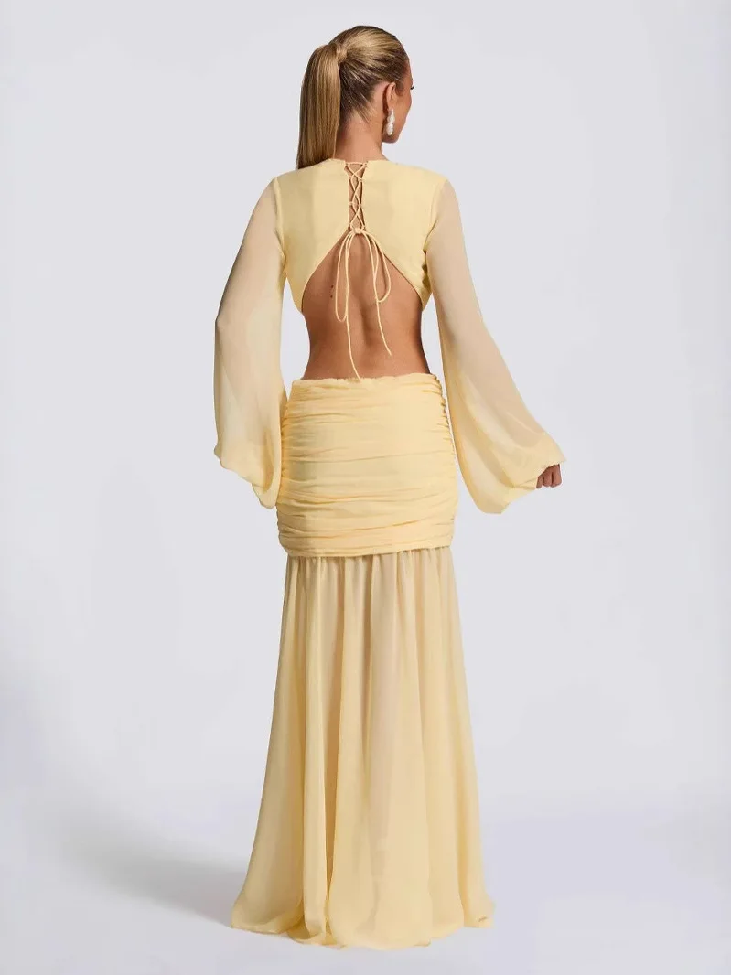 ↑2025 Women's Long Sve Hollow out Bal Dr Sexy Lace Sve Pure Color High Waist Lantern Sve Par Evening Gown - TopDealBox