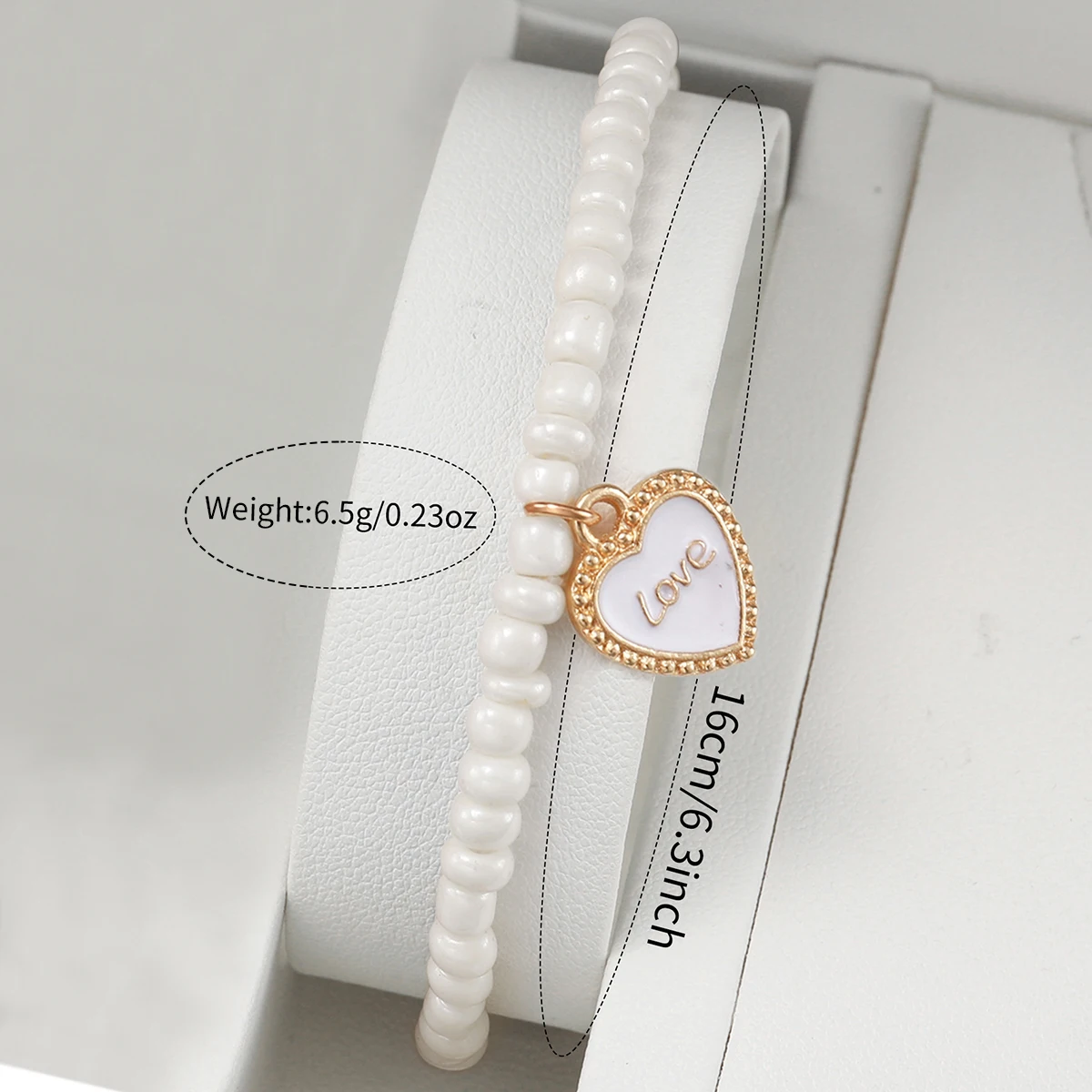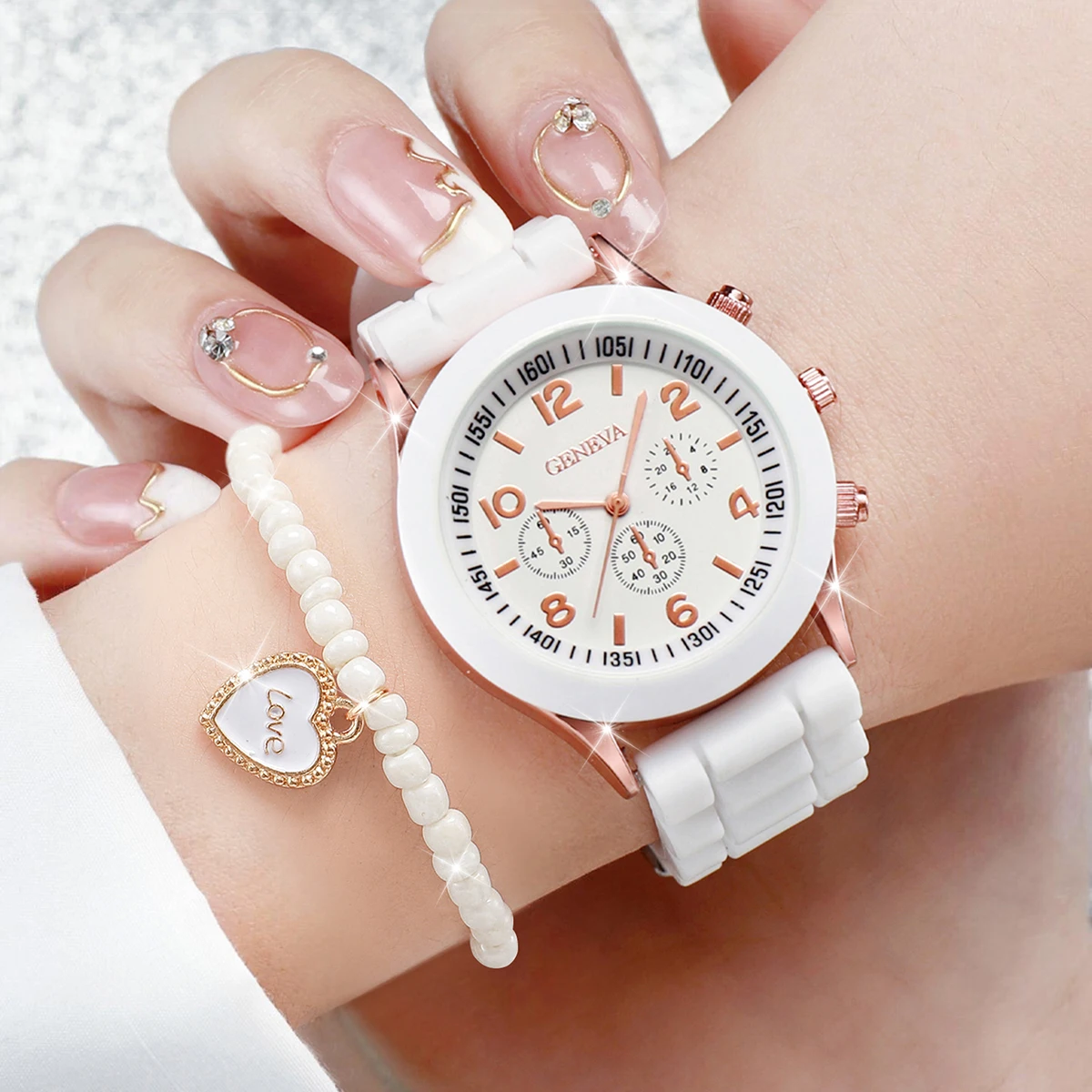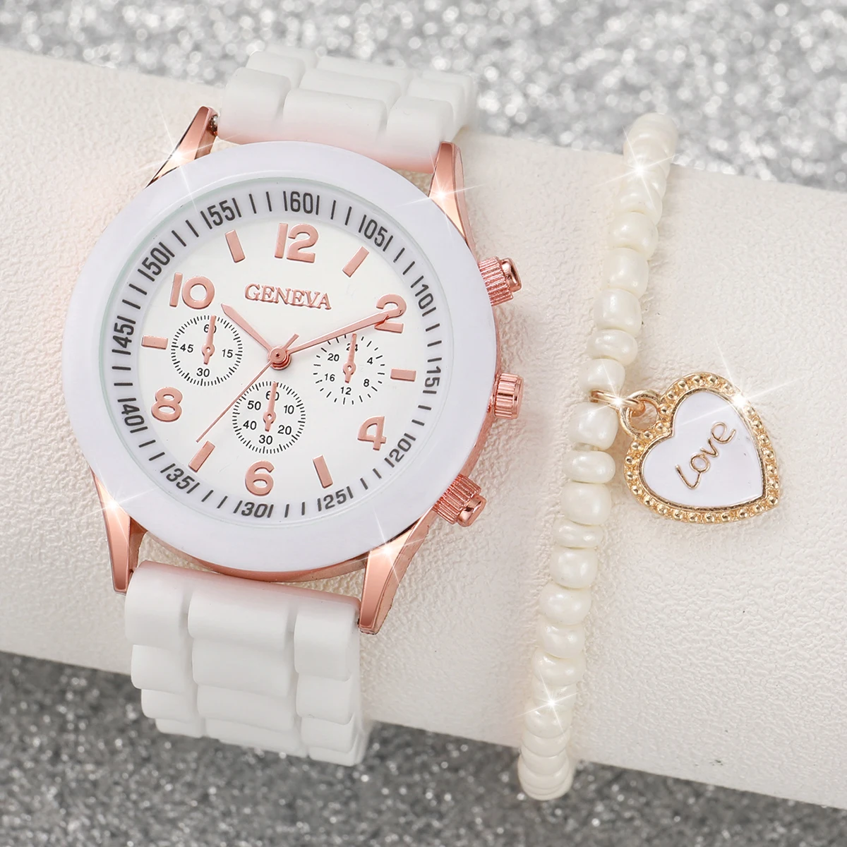 ↑2PCS/Set Fashion Arabic Dial Women's Watch Casual Silicone Band Quartz Watches Heart Beads Bracelet Set - TopDealBox
