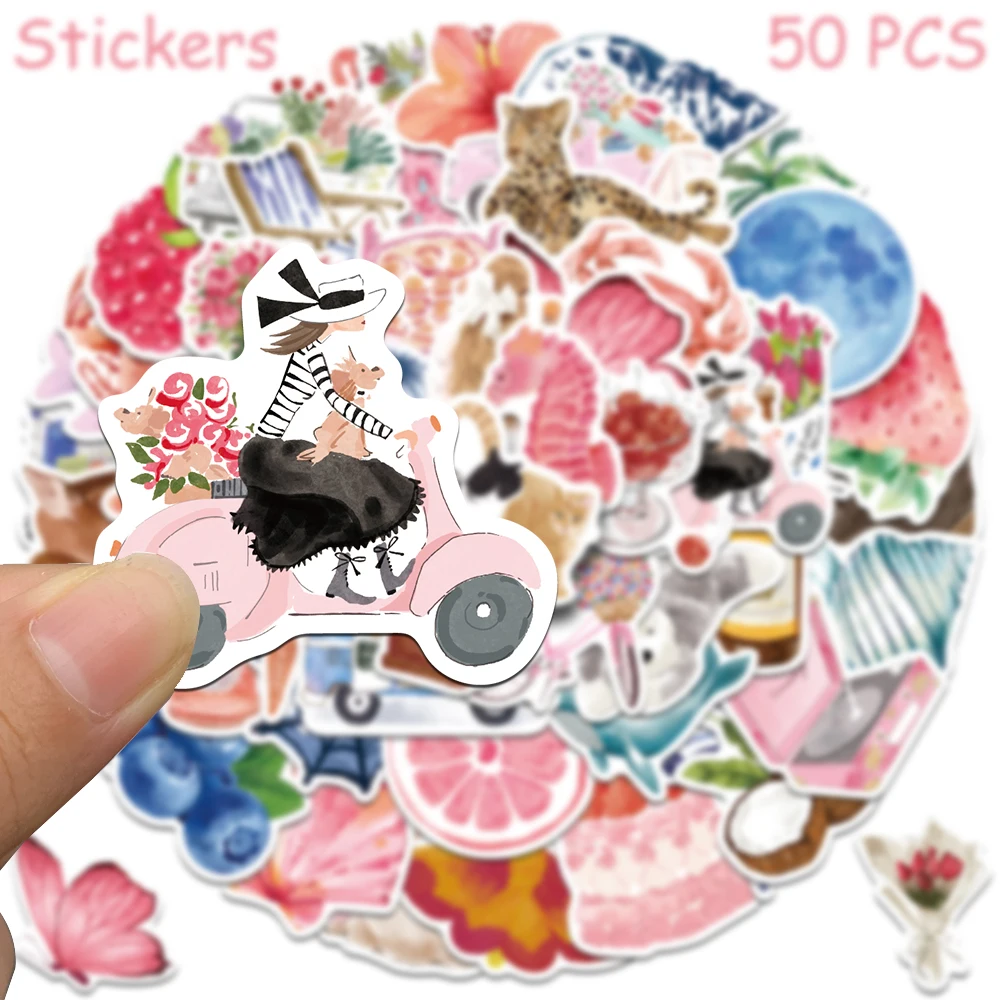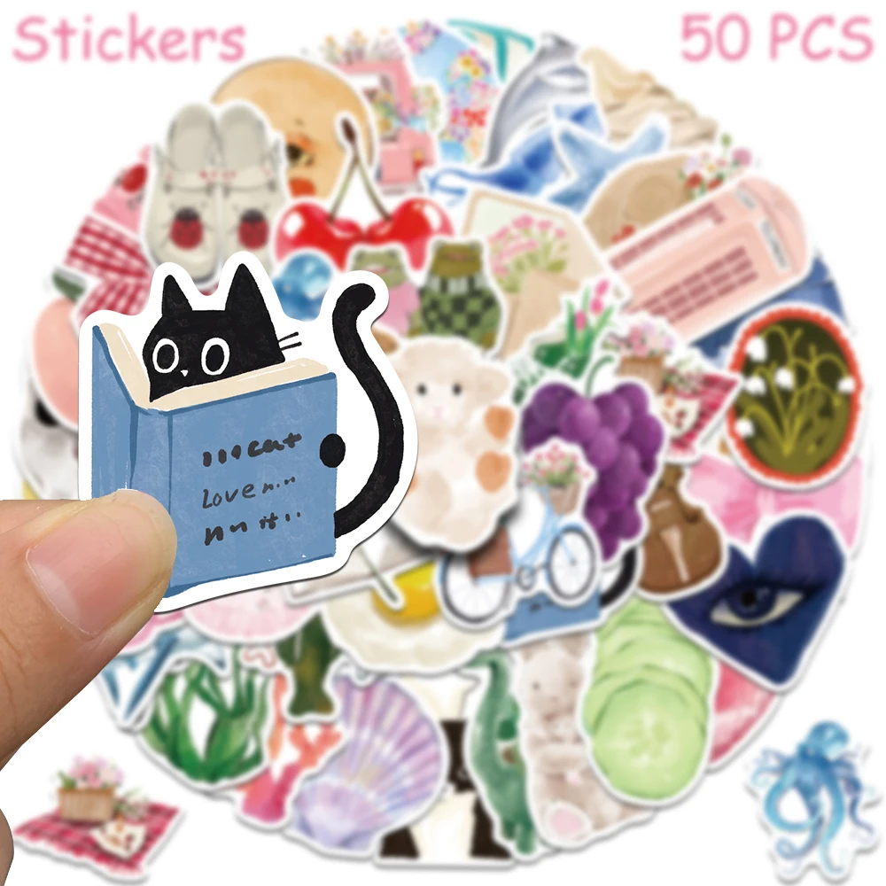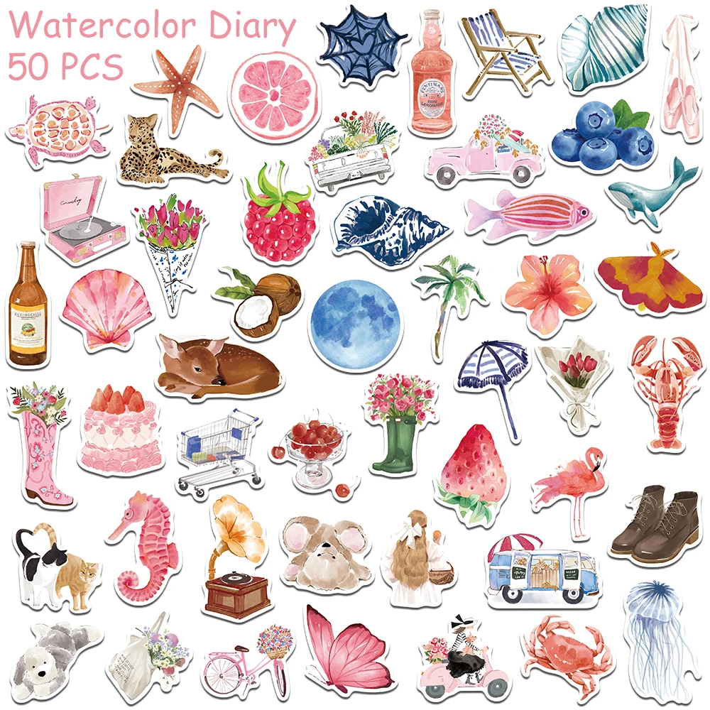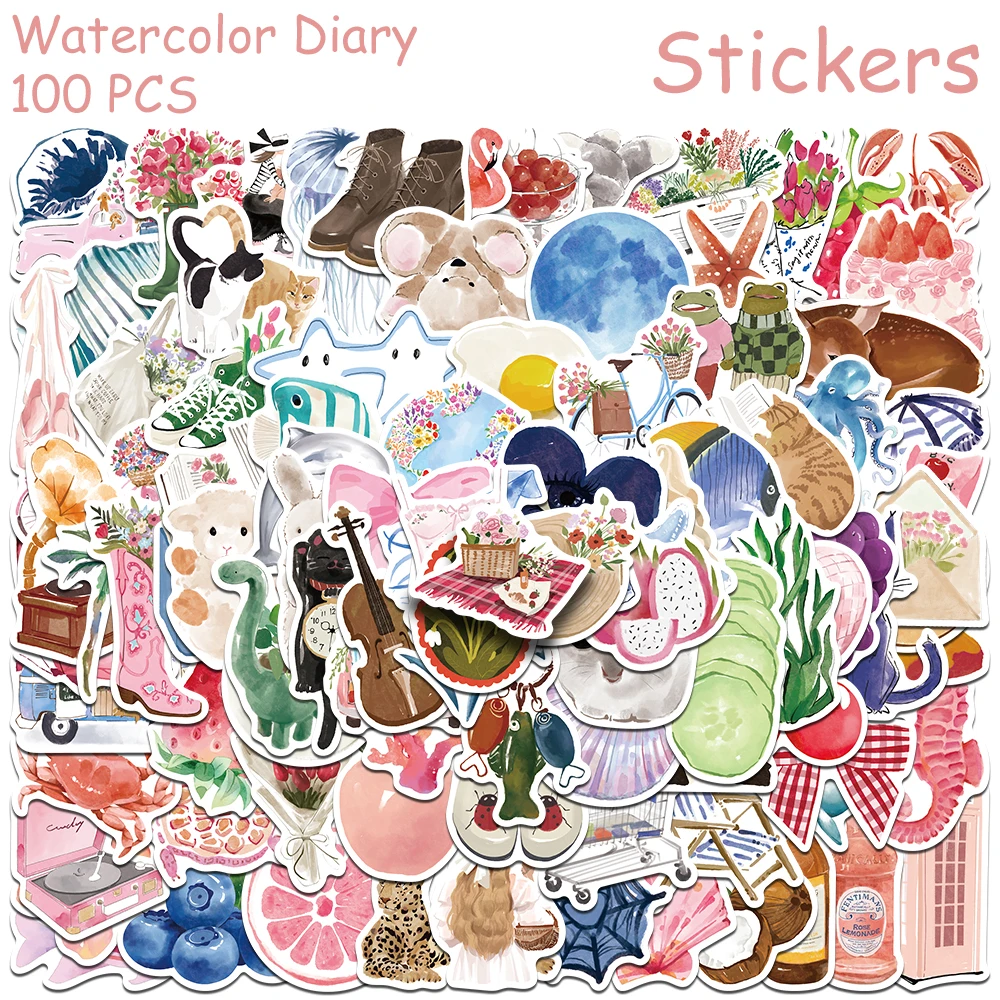 ↑50/100pcs Cartoon Watercolor Dairy Stickers Decals For Phone Laptop Scrapbook Luggage Helmet DIY Graffiti Aesthetic Stickers - TopDealBox