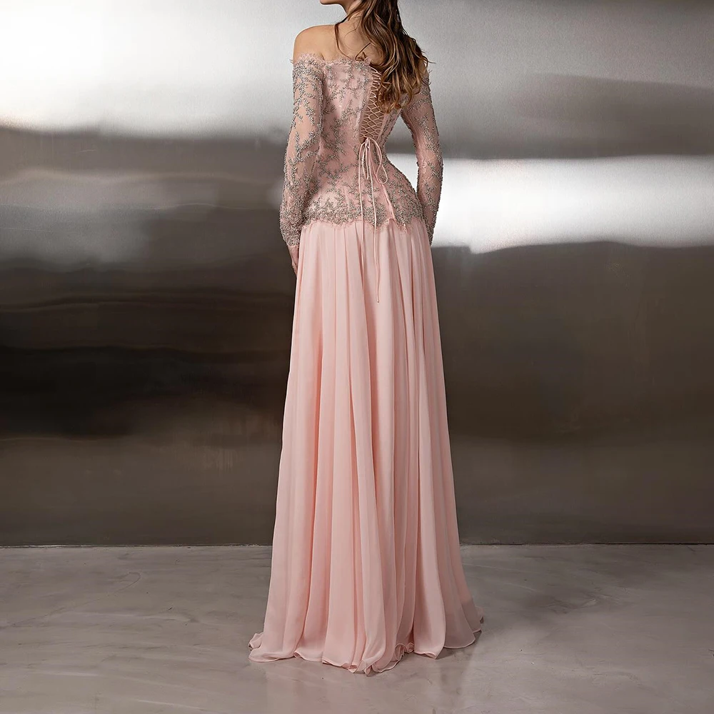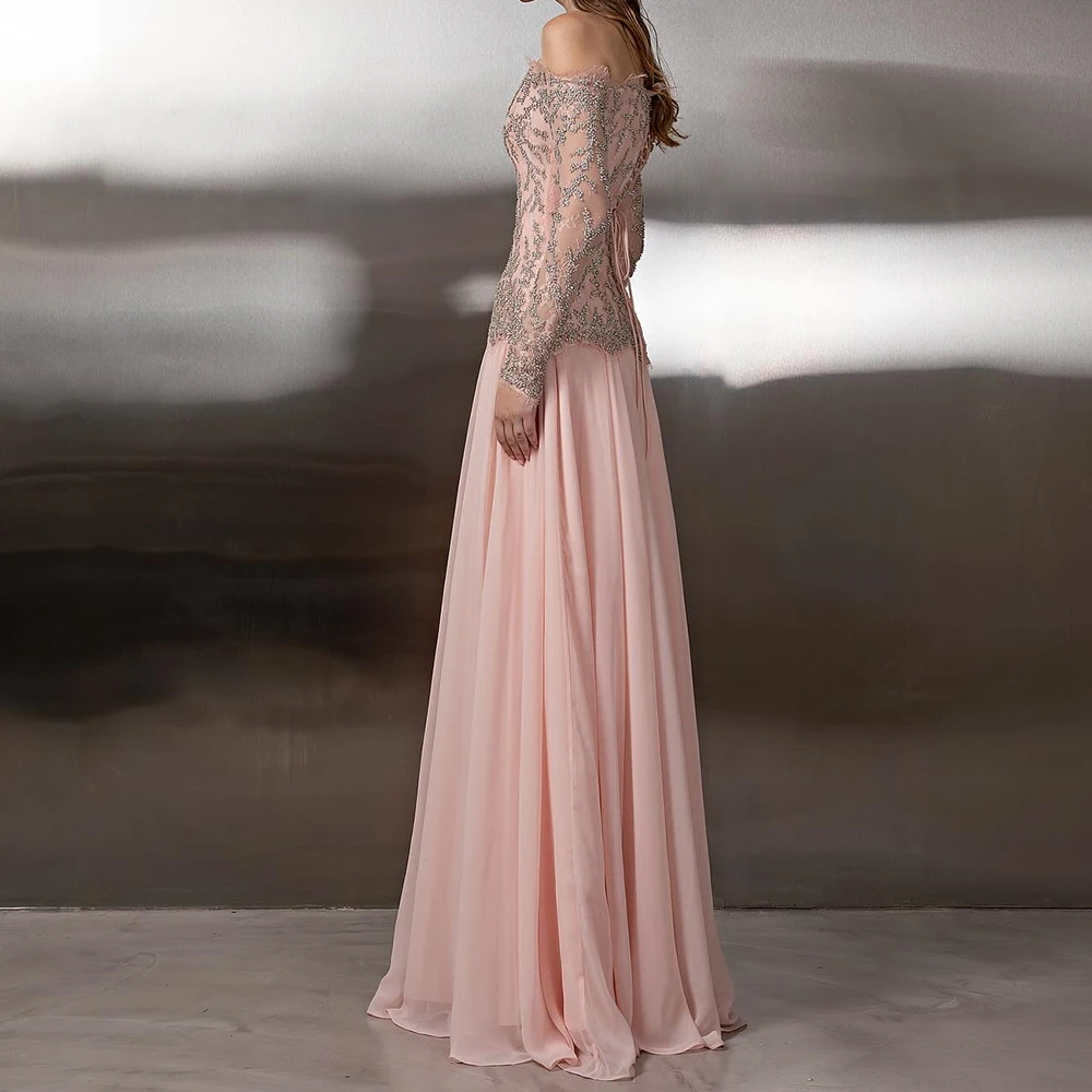 ↑Customized A-line Evening Dresses Floor-length Off The Shoulder Full Sleeve Prom Gown Fashion Sequined Simple Draped Aprty Gown - TopDealBox