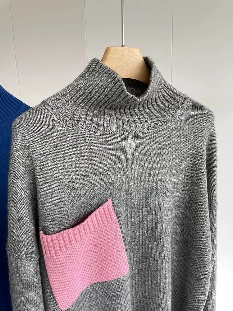 ↑Loose High Collar Wool Knit Sweater Women's Patchwork Color Blo Lazy Sle Autumn Winter Faion Casual Comfortable Top - TopDealBox