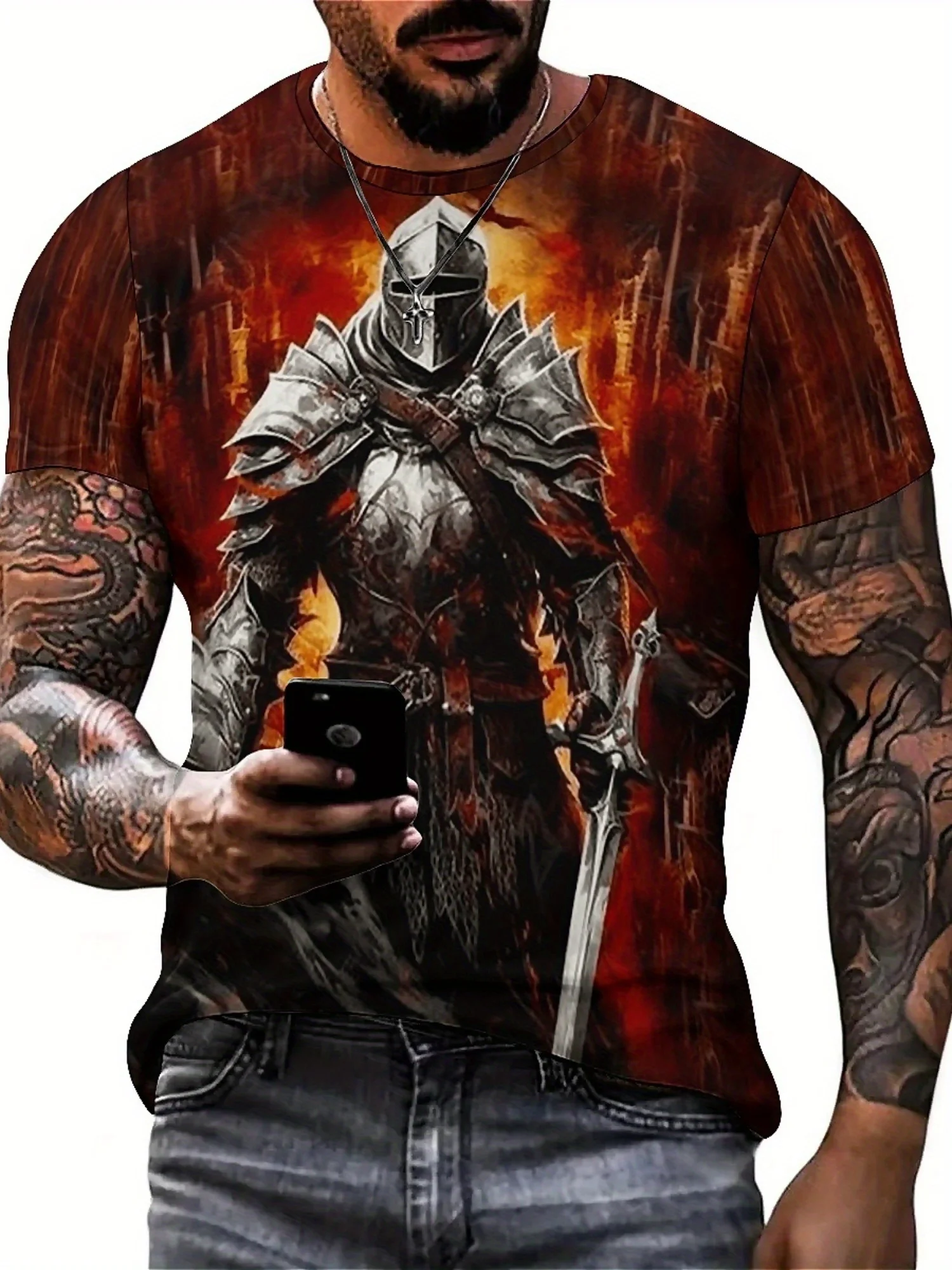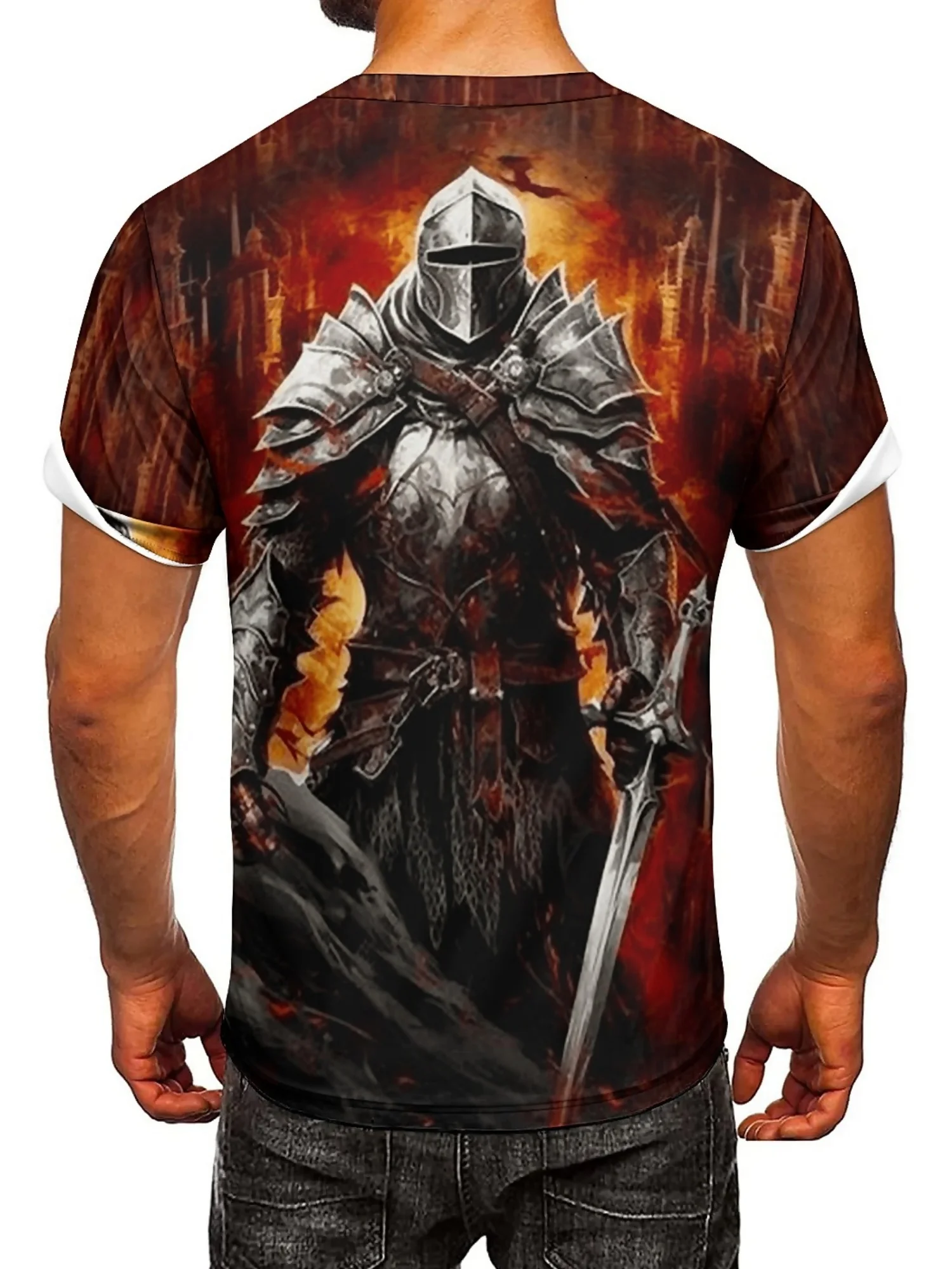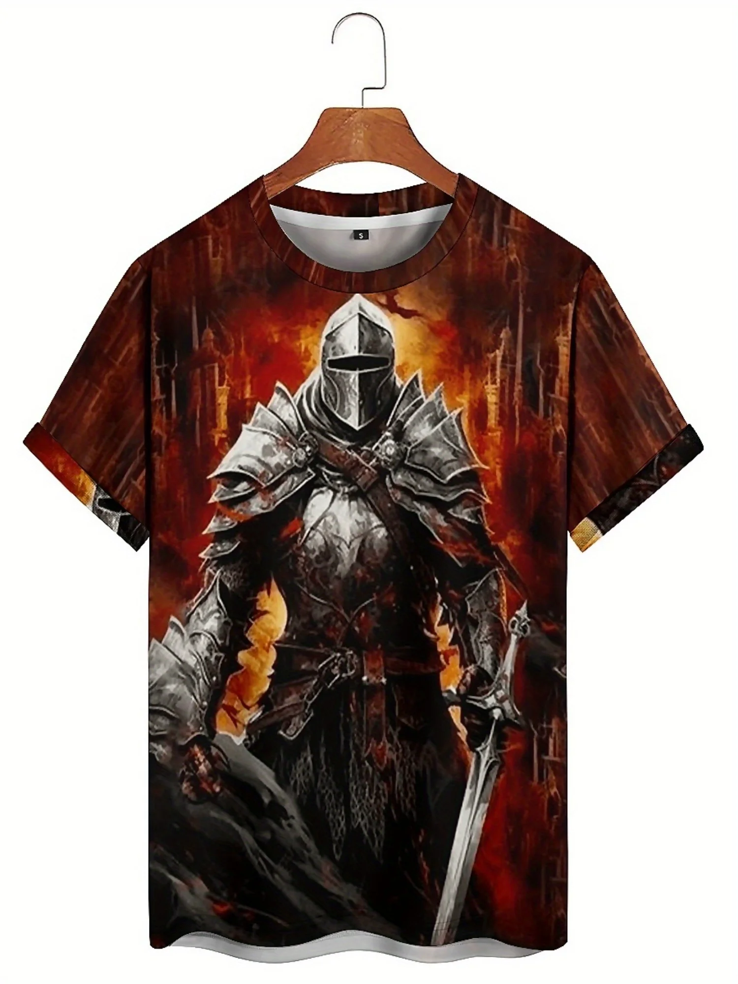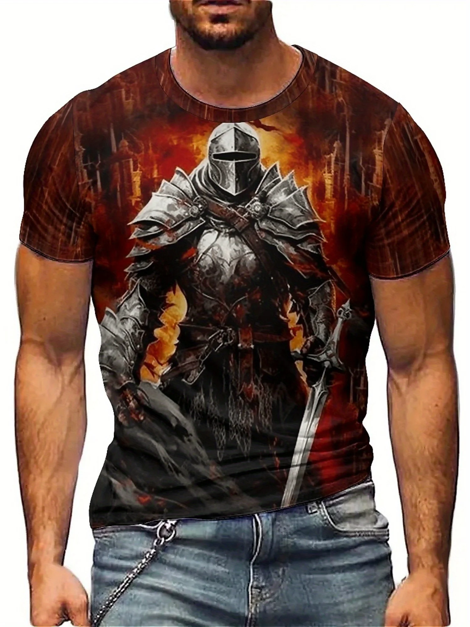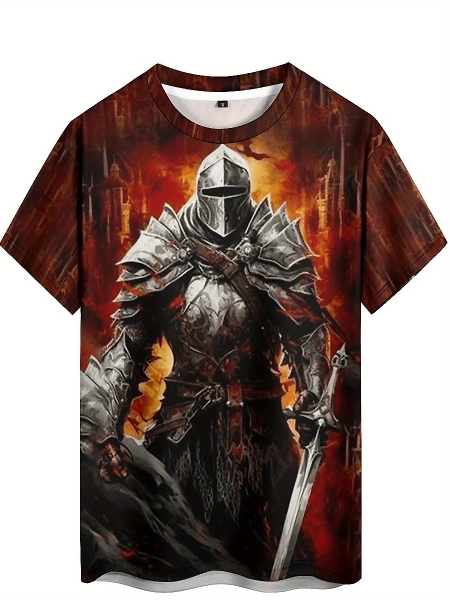 ↑Men's Medieval Knight 3D Print T-Shirt - Retro Armor & Flames Design, Short Sleeve, Loose Fit, Polyester, Cool Hip-Hop Style - TopDealBox