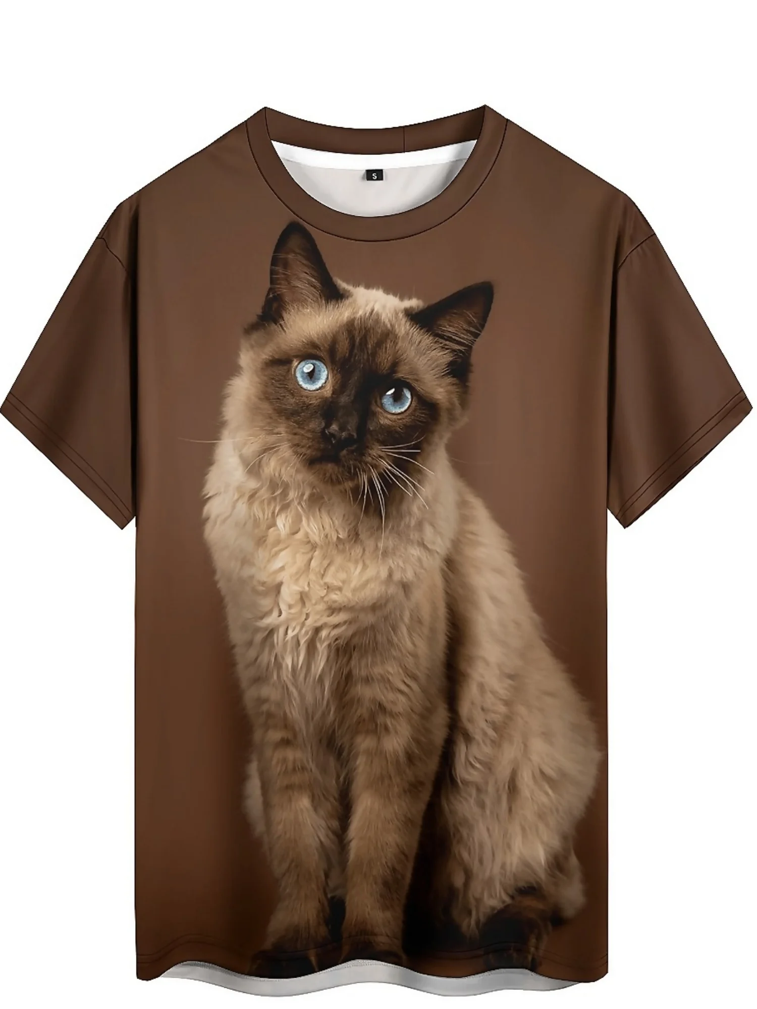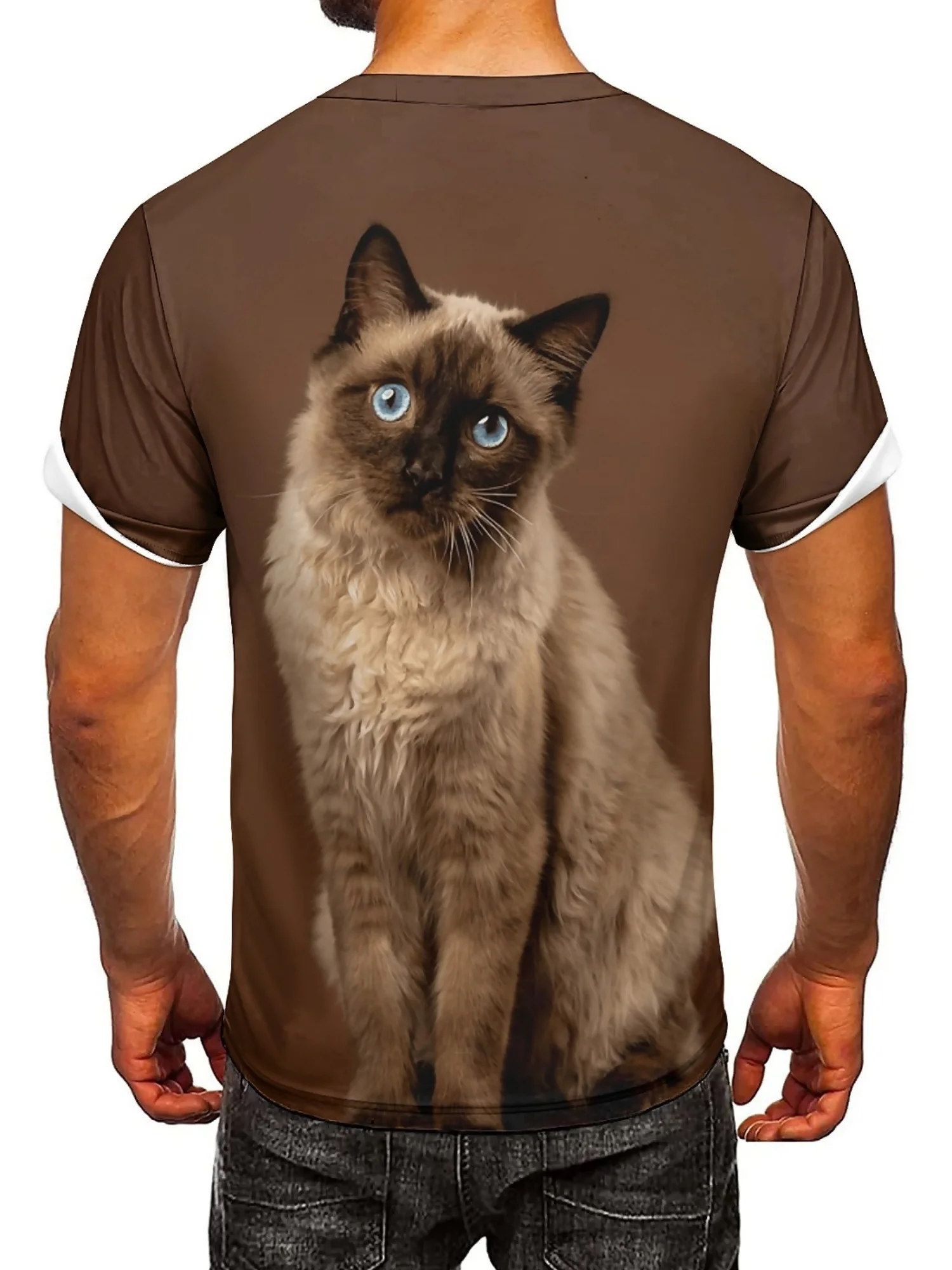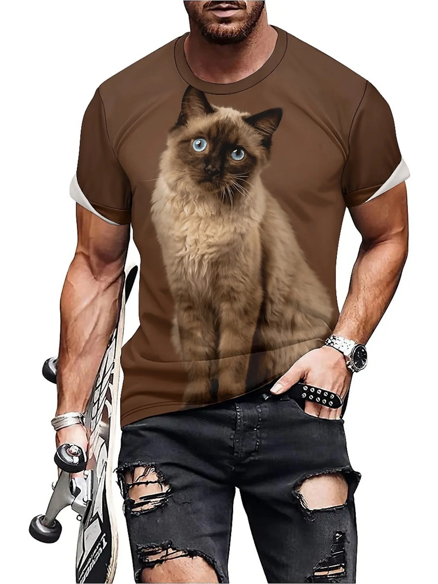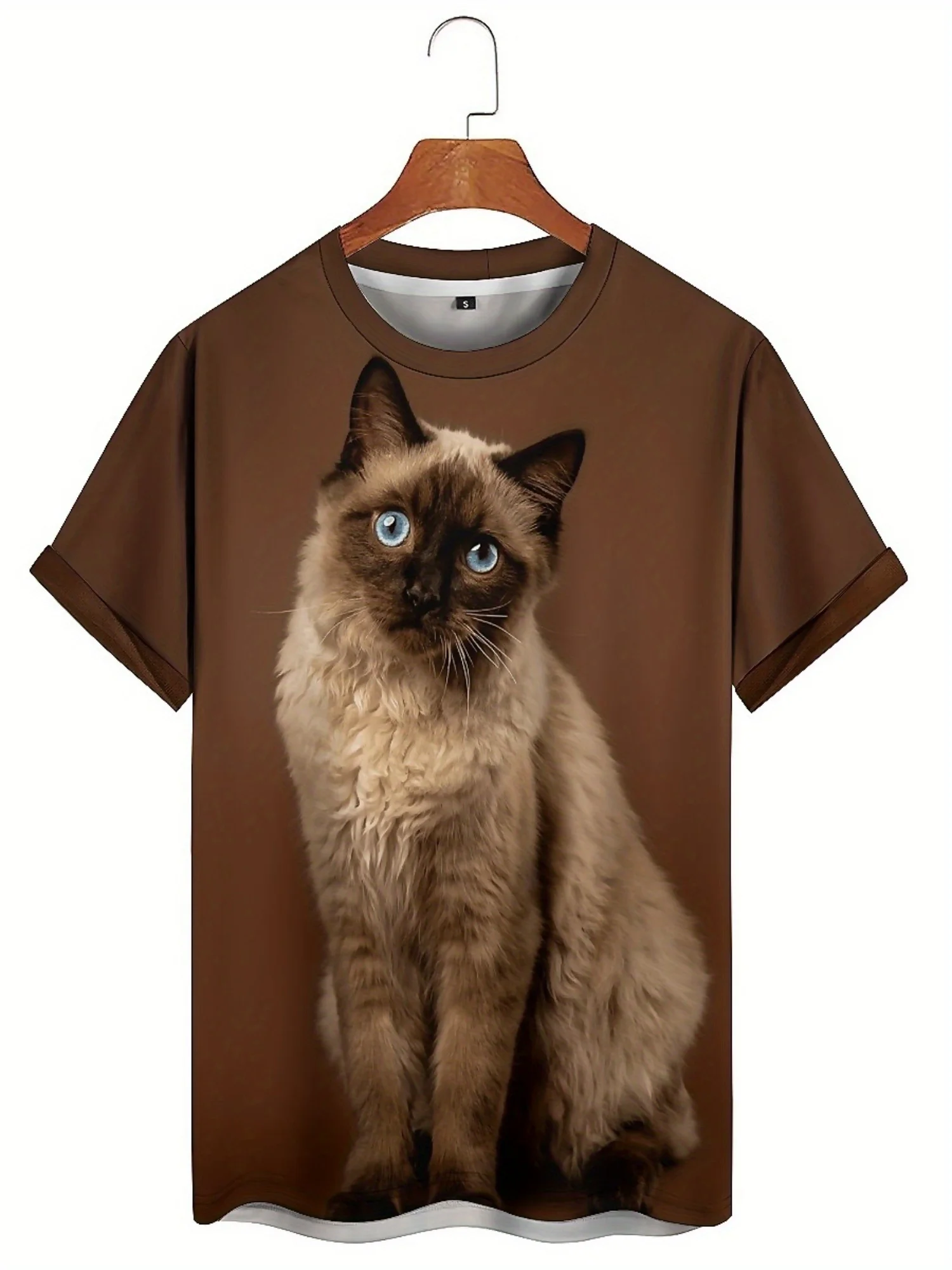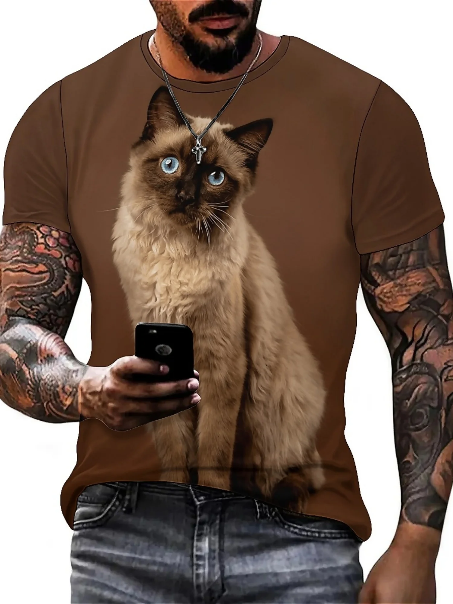 ↑Men'S Plus Size 3D Cat Face Graphic T-Shirt - Cool Hip-Hop Style, Breathable Polyester, Casual Summer Short Sleeve Tee - TopDealBox