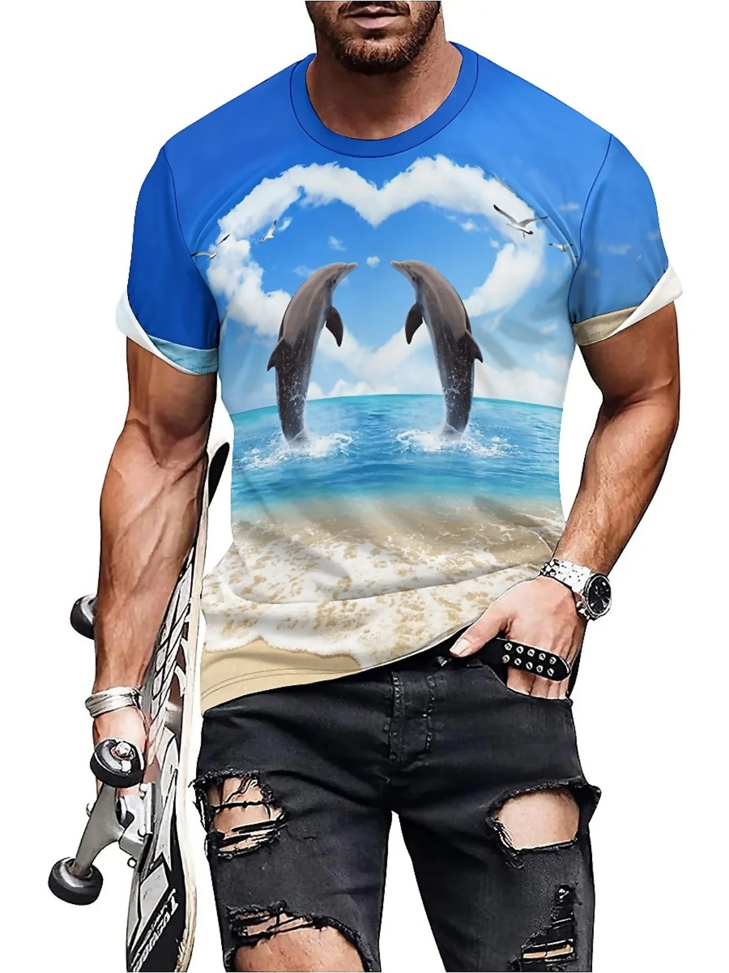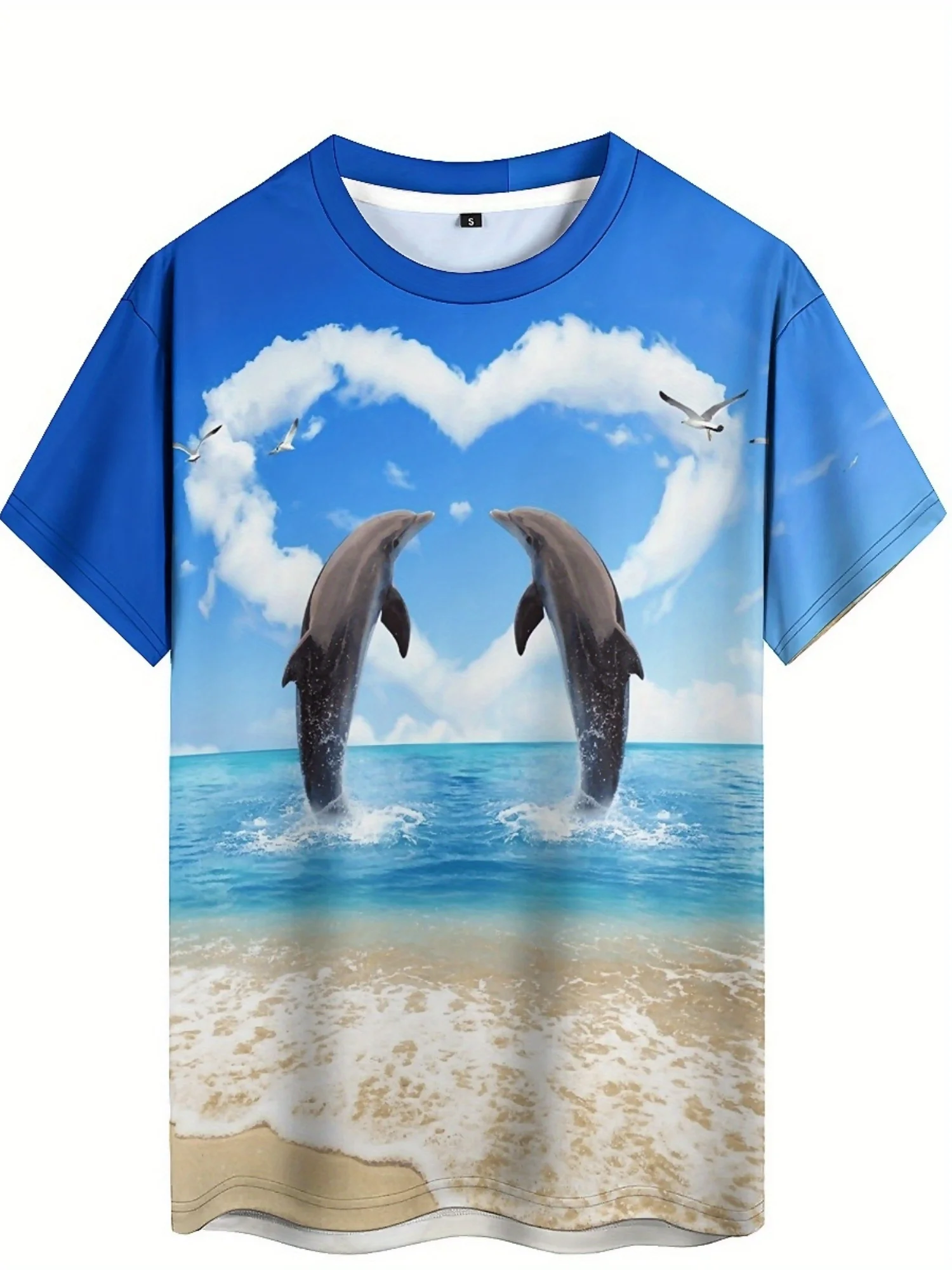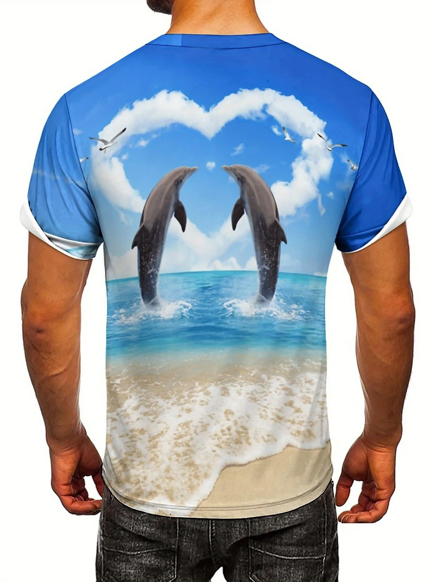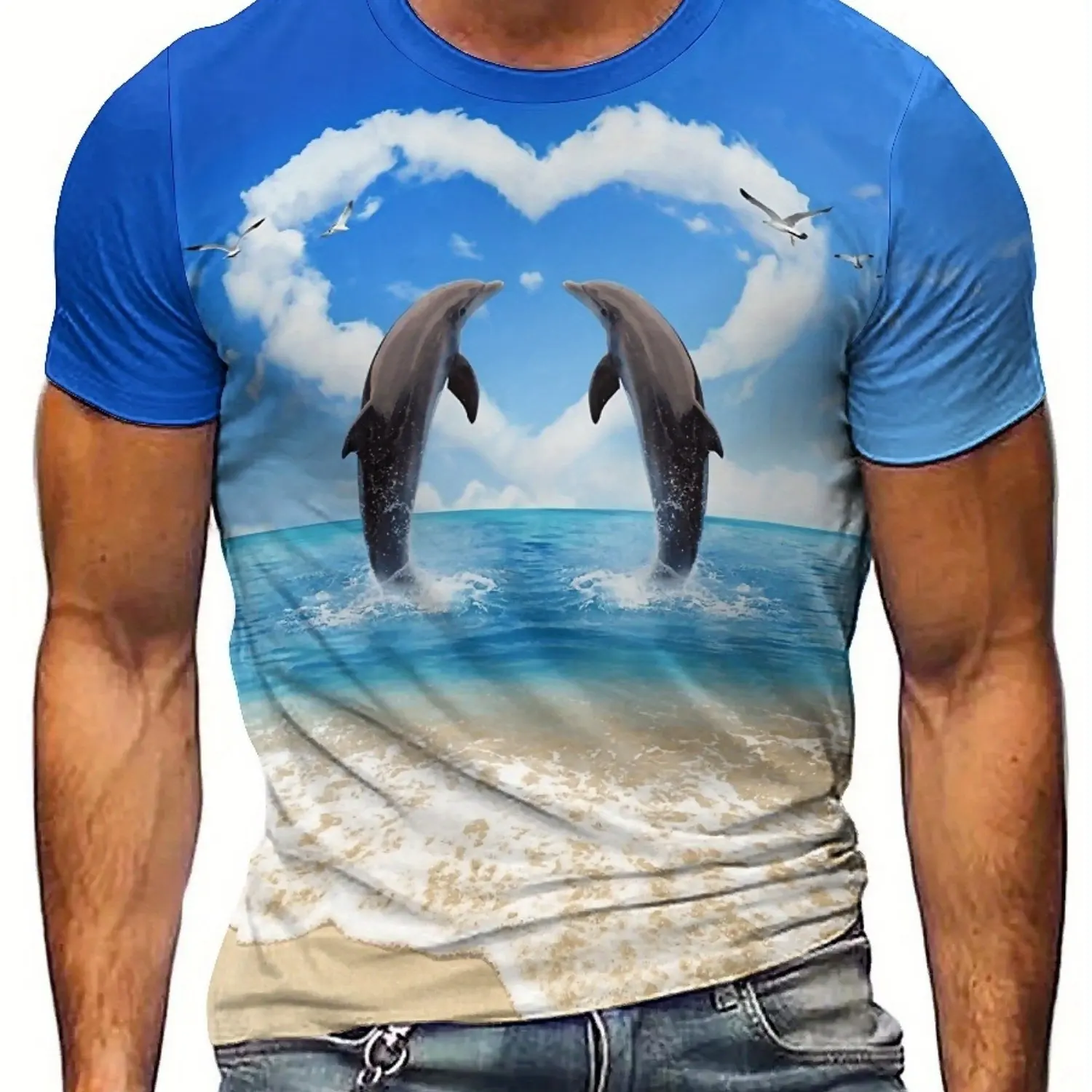 ↑Men'S Soft Polyester 3D Dolphin Print T-Shirt - Vibrant Beach Scene with Dolphins, Short Sleeve, Crew Neck, Machine Washable - TopDealBox