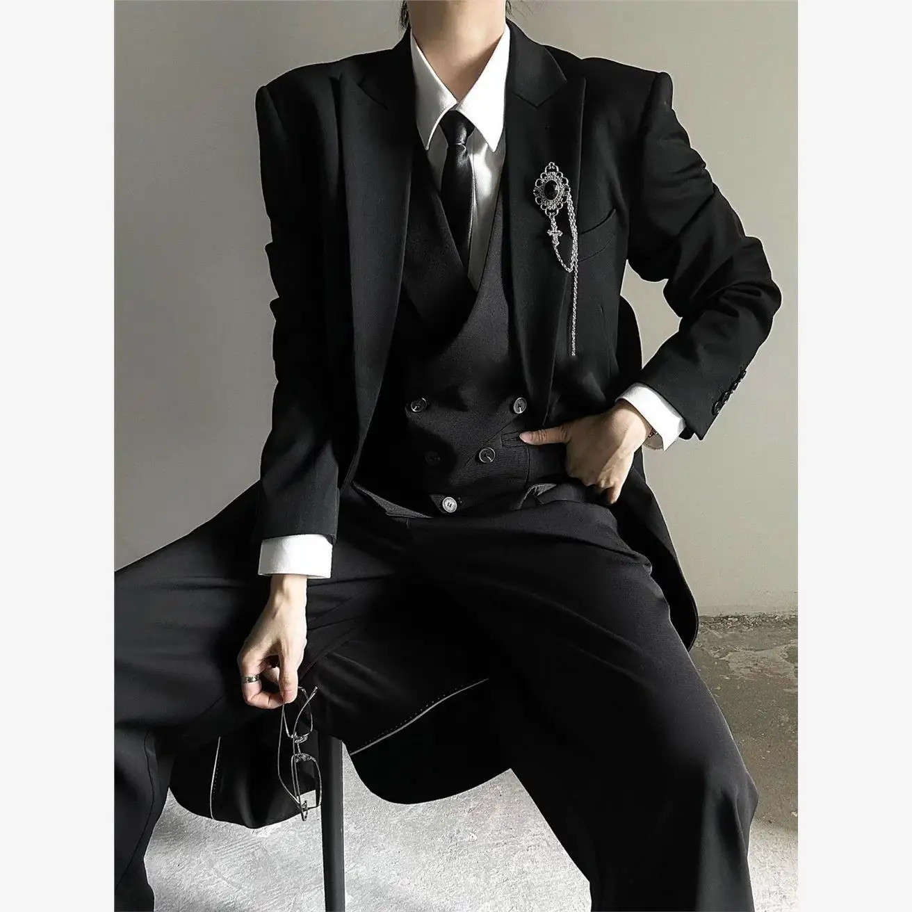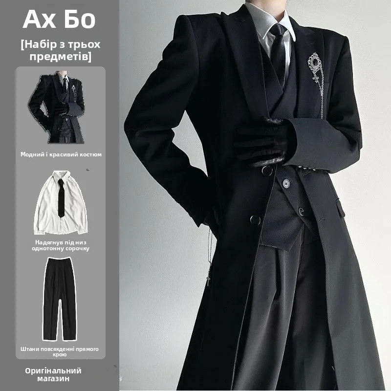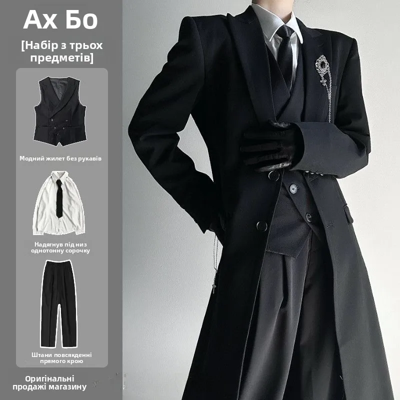 ↑New 2025 Mens Long Tailored Coat Jaet Set Neutral Sle Premium Bla oulder Level Suit Four Piece Suit Casual Autumn Wear - TopDealBox