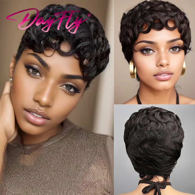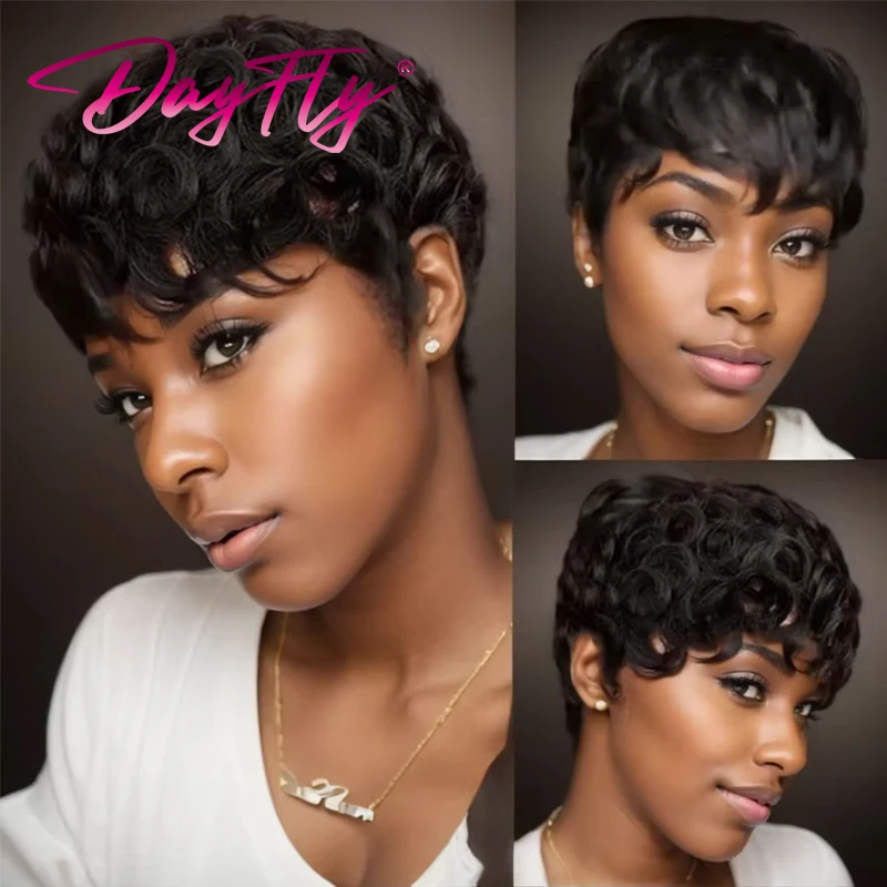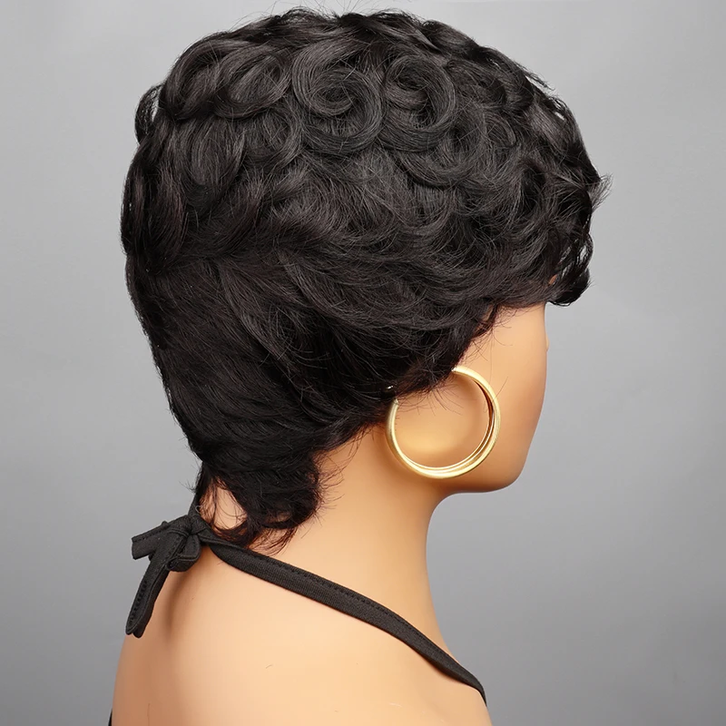 ↑Short Pixie Cut Wig Curly Wigs For Black Women Brazilian Human Hair Bob Natural Black Curly Human Hair Machine Made Wigs 150% - TopDealBox