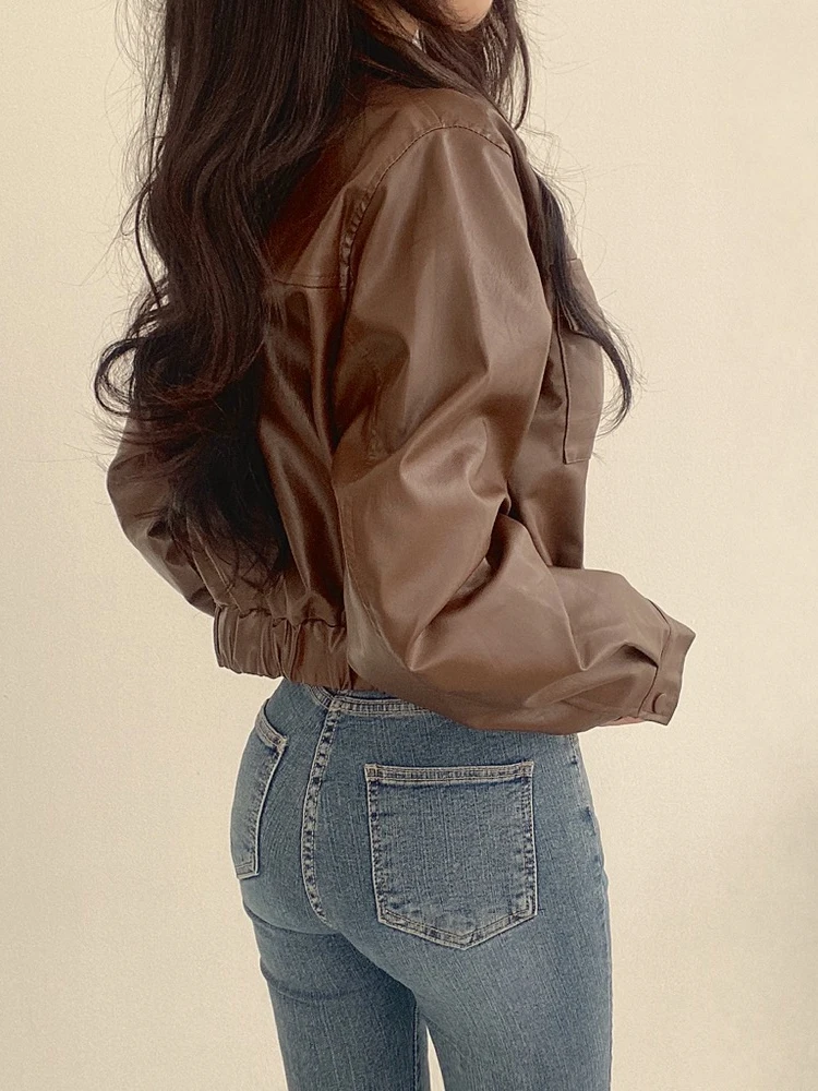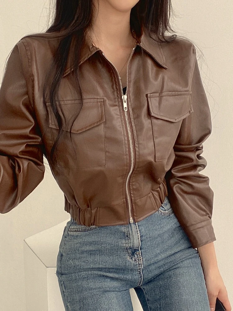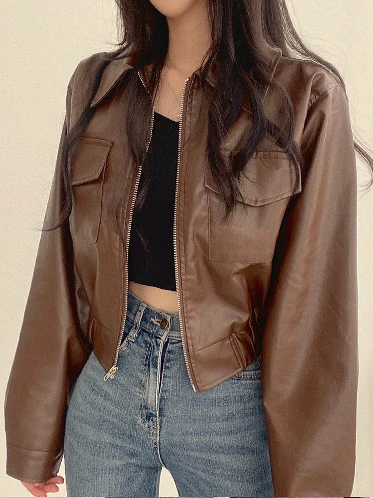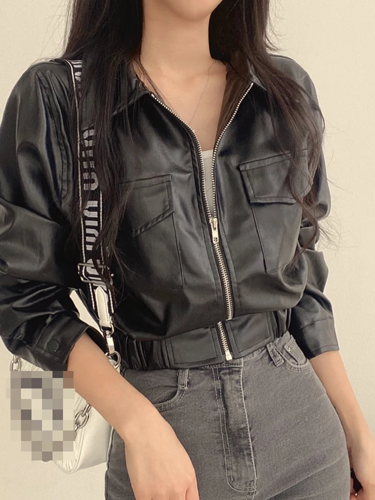 ↑Premium ort PU Leather Jaet Women's Korean Sle Loose Fit Slimming Zipper Collar Biker Coat for Autumn Winter - TopDealBox