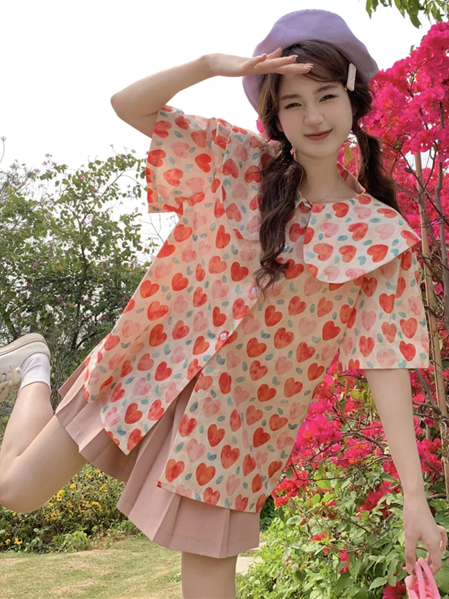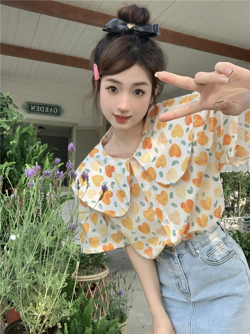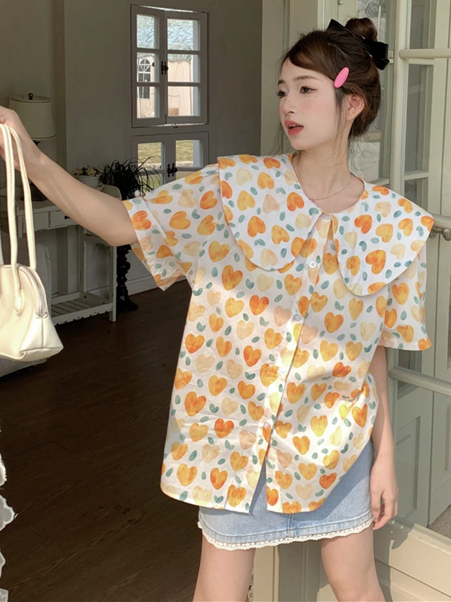 ↑Summer Cotton Blouses For Women Gentle Sweet Doll Collar Shirts Single-breasted Loose Versatile Short Sleeves Lovely Tops - TopDealBox