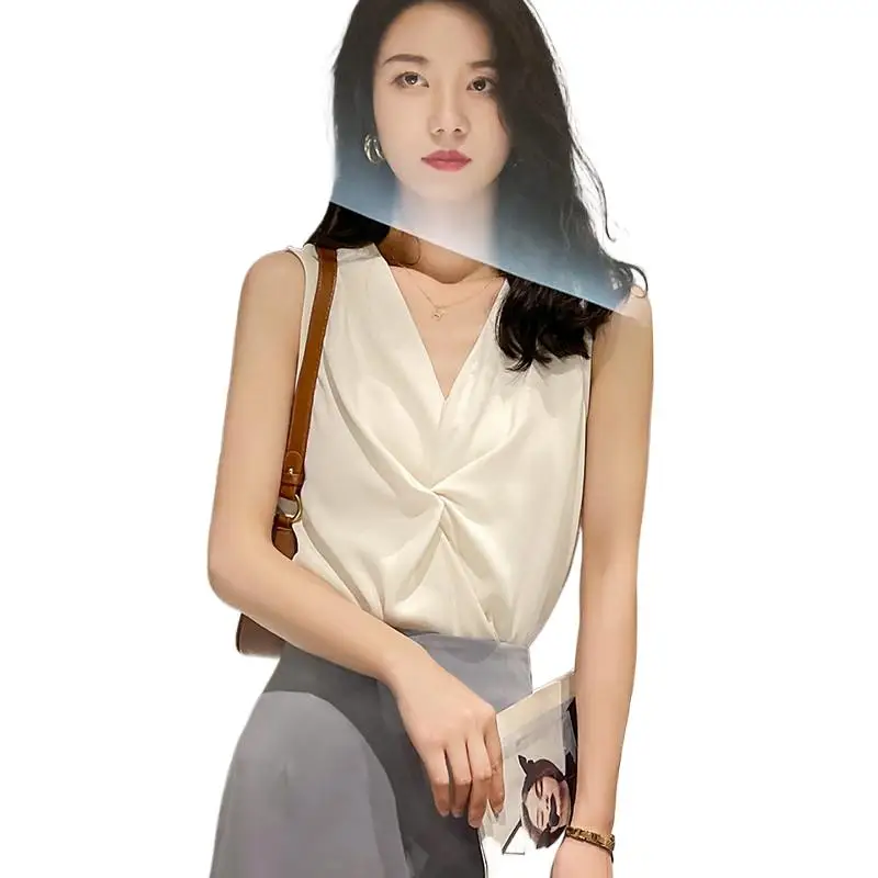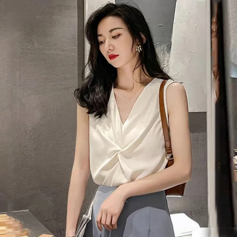 ↑Women low cut artificial silk Pleated Vest top OL style Women wild White chiffon shirt Office lady elegant Acetate satin blouse - TopDealBox