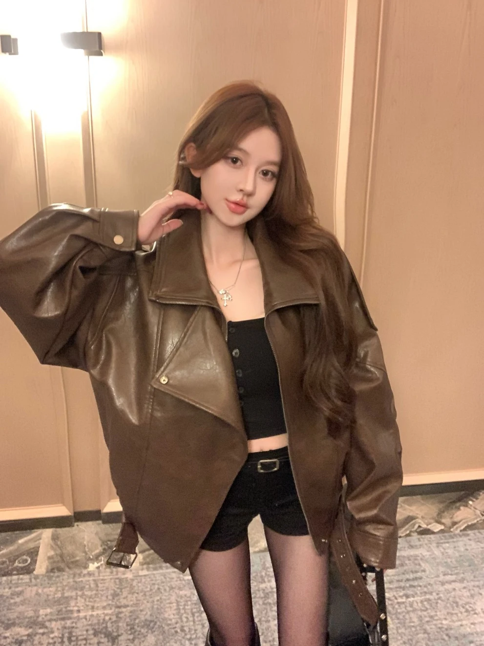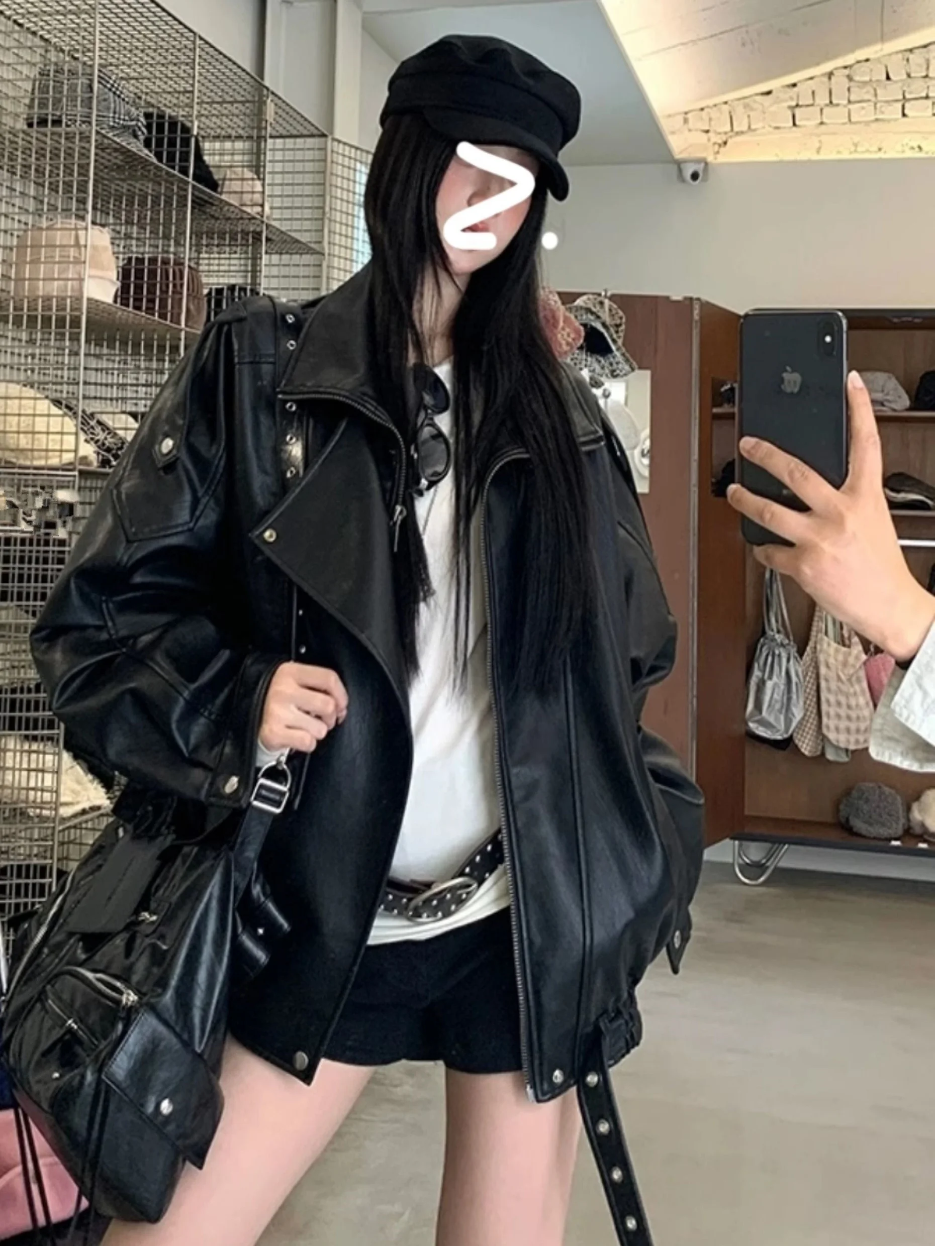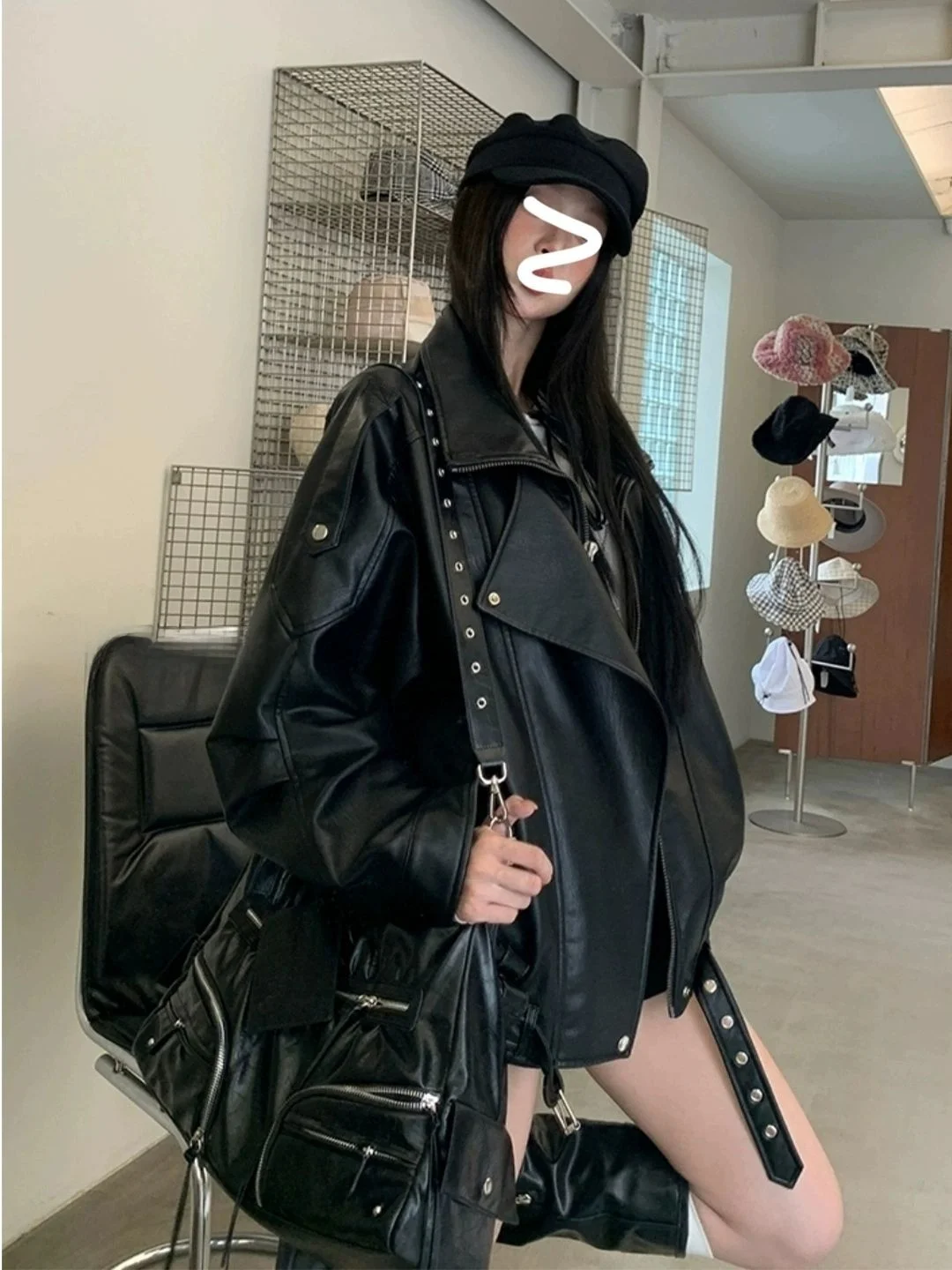 ↑Women's Bla Leather Jaet Heavyweight PU Motorcycle Sle Loose Fit Autumn Winter Faion Outerwear ort Coat - TopDealBox
