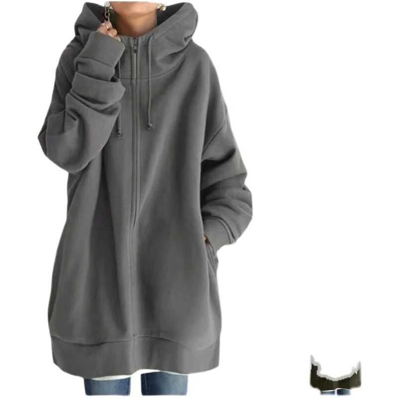 ↑Zagros Oversized S-5XL Women's Autumn Velvet-Lined X-Long Hooded Coat Tie Collar Long Sleeve Zipper Up Sweatshirt JYFS-HS0714 - TopDealBox